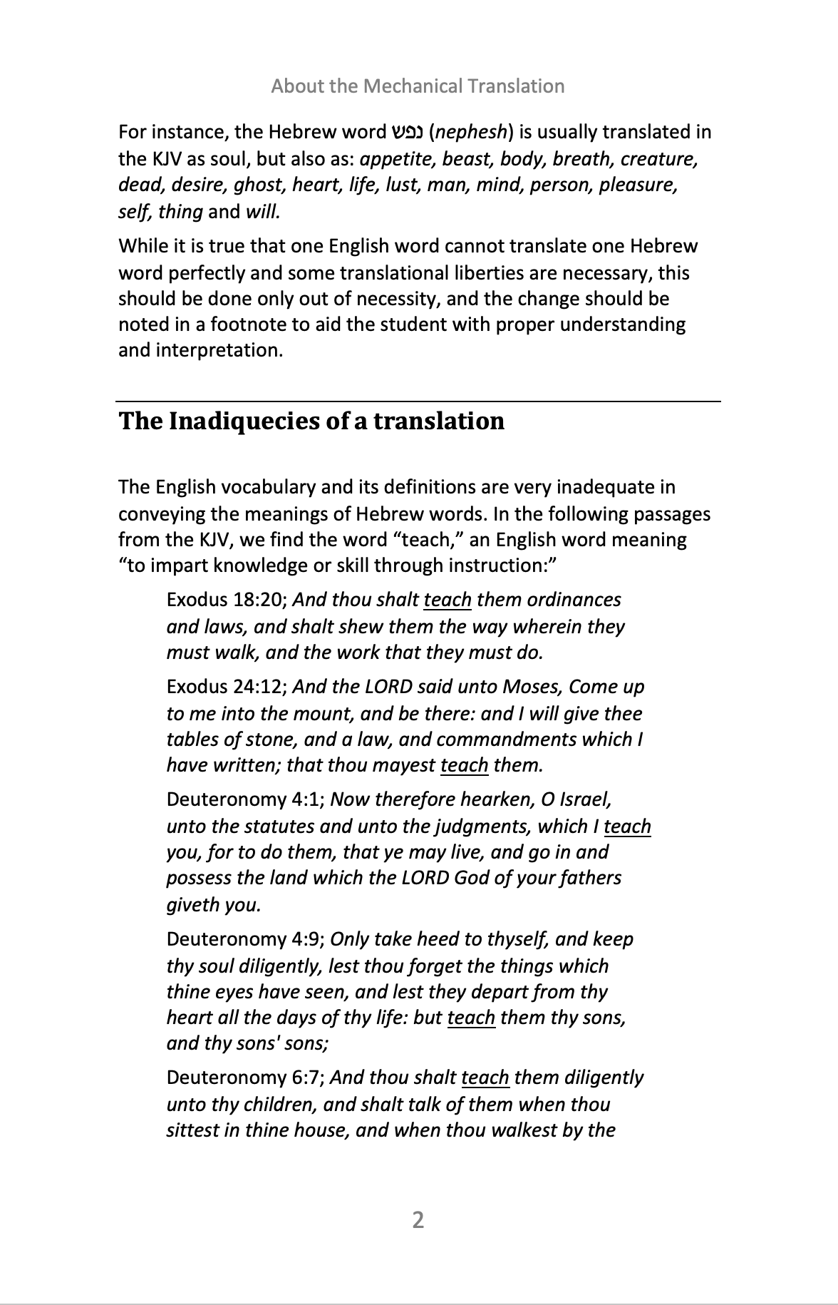 The Mechanical method of translating is a new and unique style that translates each Hebrew word, prefix and suffix exactly the same way every time it occurs and in the same order as they appear in the Hebrew. This translation will allow the reader to see the Hebrew, through the English, without the interjection of a translator’s theological opinions and bias. (423 pages)