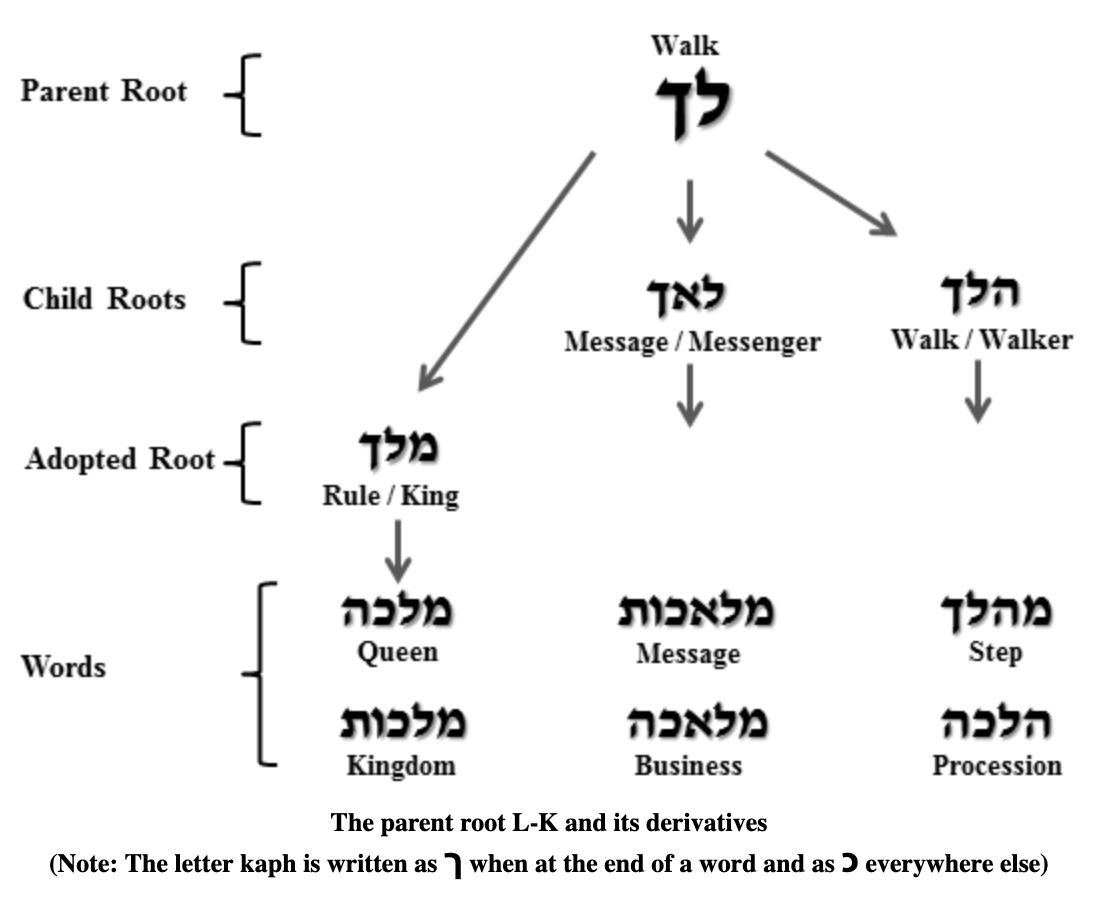 Derived from the parent root לך (LK) are two child roots, הלך (HLK) and לאך (LAK), and one adopted root, מלך (MLK). The child הלך is formed by adding the letter ה (H) to the beginning of the parent, the child לאך by adding the letter א (A) in the middle and the adopted by adding the letter מ (M) to the beginning.