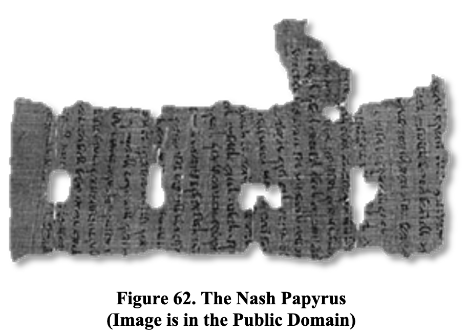 Another very ancient fragment of the Hebrew Bible is the Nash Papyrus (Figure 62) discovered in Egypt in 1898. The fragment includes the Ten Commandments (Exodus 20:2-17) and the Sh’ma (Deuteronomy 6:4) and is dated to the 2nd century BC.