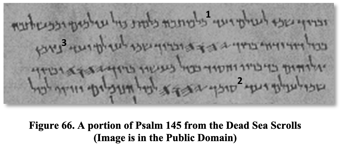 When we examine Psalm 145 from the Dead Sea Scrolls, we find between the verse beginning with the מ (mem), identified with a “1” in Figure 66 above, and the verse beginning with the ס (samehh), identified with a “2”, the missing verse, beginning with the letter נ (nun), is present and identified with a “3” and reads as follows: