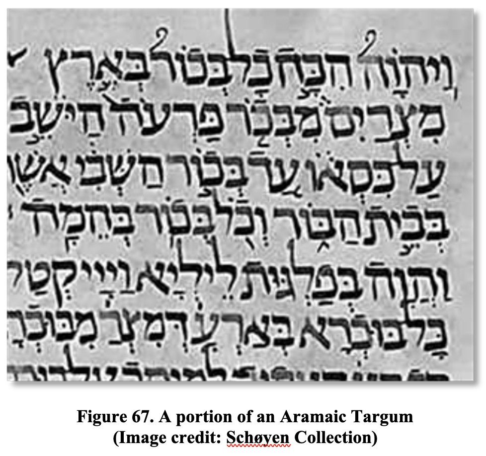 Of the many Aramaic translations of the Hebrew Bible (see Figure 67), two are principal ones. Targum Onkelos is an Aramaic translation of the first five books of the Bible written in the 1st century AD by Onkelos, a Roman convert to Judaism. The second is the Targum Jonathan, an Aramaic translation of the prophets. It was written in the 1st century BC by Jonathan Ben Uziel, a student of Hillel the Elder, a famous Jewish teacher and religious leader.