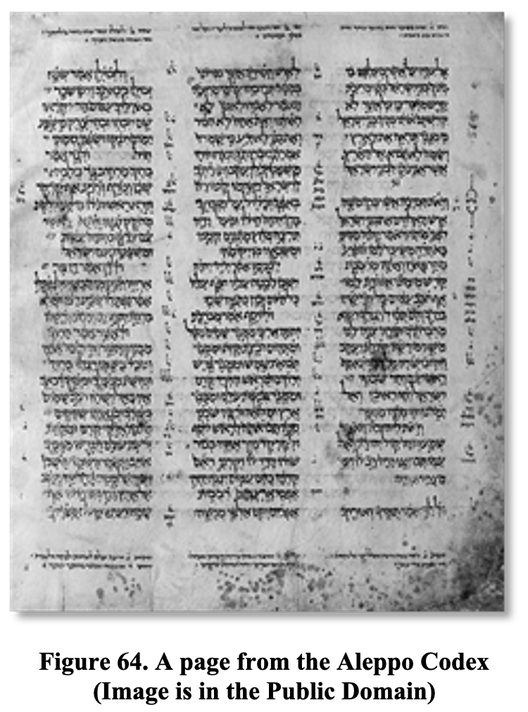 Until the discovery of the Dead Sea Scrolls, the oldest existing complete Hebrew Bible was the Aleppo Codex (Figure 64), also called the Masoretic text, which was written in the 10th century AD, a thousand years after the Dead Sea Scrolls. For centuries, this text has been the foundation for Jewish and Christian translators.