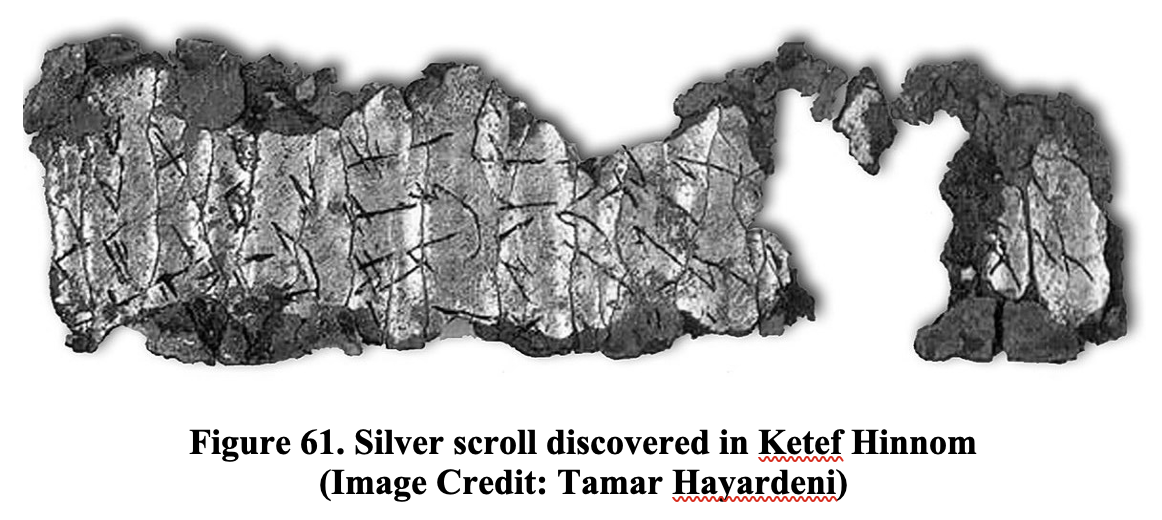 The oldest text of the Hebrew Bible was discovered in a tomb at Ketef Hinnom (Figure 61) in Israel in 1979. The text, inscribed on a silver scroll in a Paleo-Hebrew script dating to the 7th century BC, is the Aaronic blessing, which begins, yeverekh’kha YHWH Vayishmarekha (May YHWH bless you and keep you).