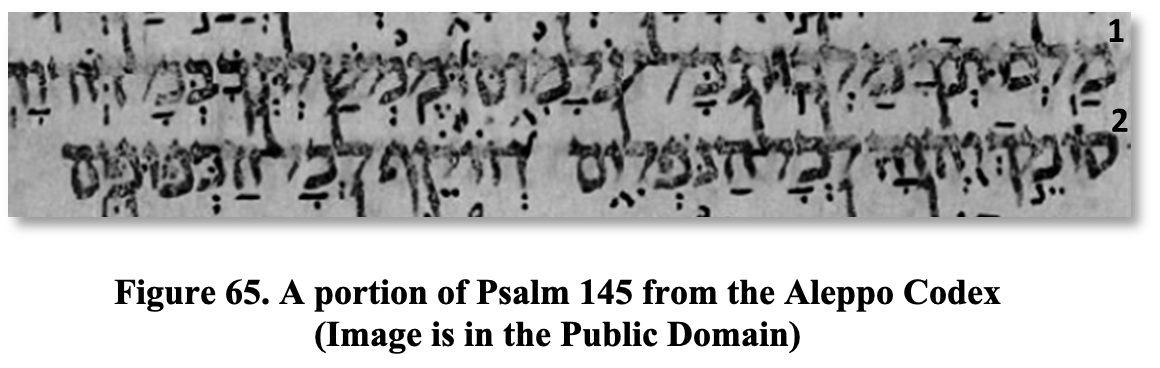 Psalm 145 is an acrostic psalm where each verse begins with successive letters of the Hebrew alphabet. In the Aleppo Codex, the first verse begins with the letter aleph, the second with the beyt, the third with the gimel, and so on. Verse 13 begins with the letter מ (mem), identified with the number “1” in Figure 65 above, the 13th letter of the Hebrew alphabet. The next verse in the image, identified with the number “2,” begins with the letter ס (samehh), the 15th letter of the Hebrew alphabet. There is no verse beginning with the 14th letter נ (nun).